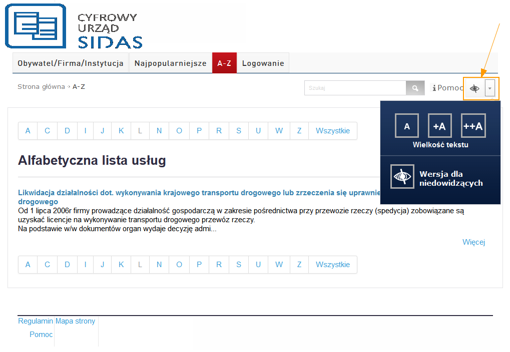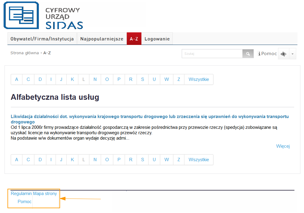• poprzez skorzystanie z alfabetycznego spisu usług: zakładka A-Z (lista prezentuje te zaczynające się na wybraną literę alfabetu. Litery, pod którymi nie kryją się żadne usługi są niewidoczne);